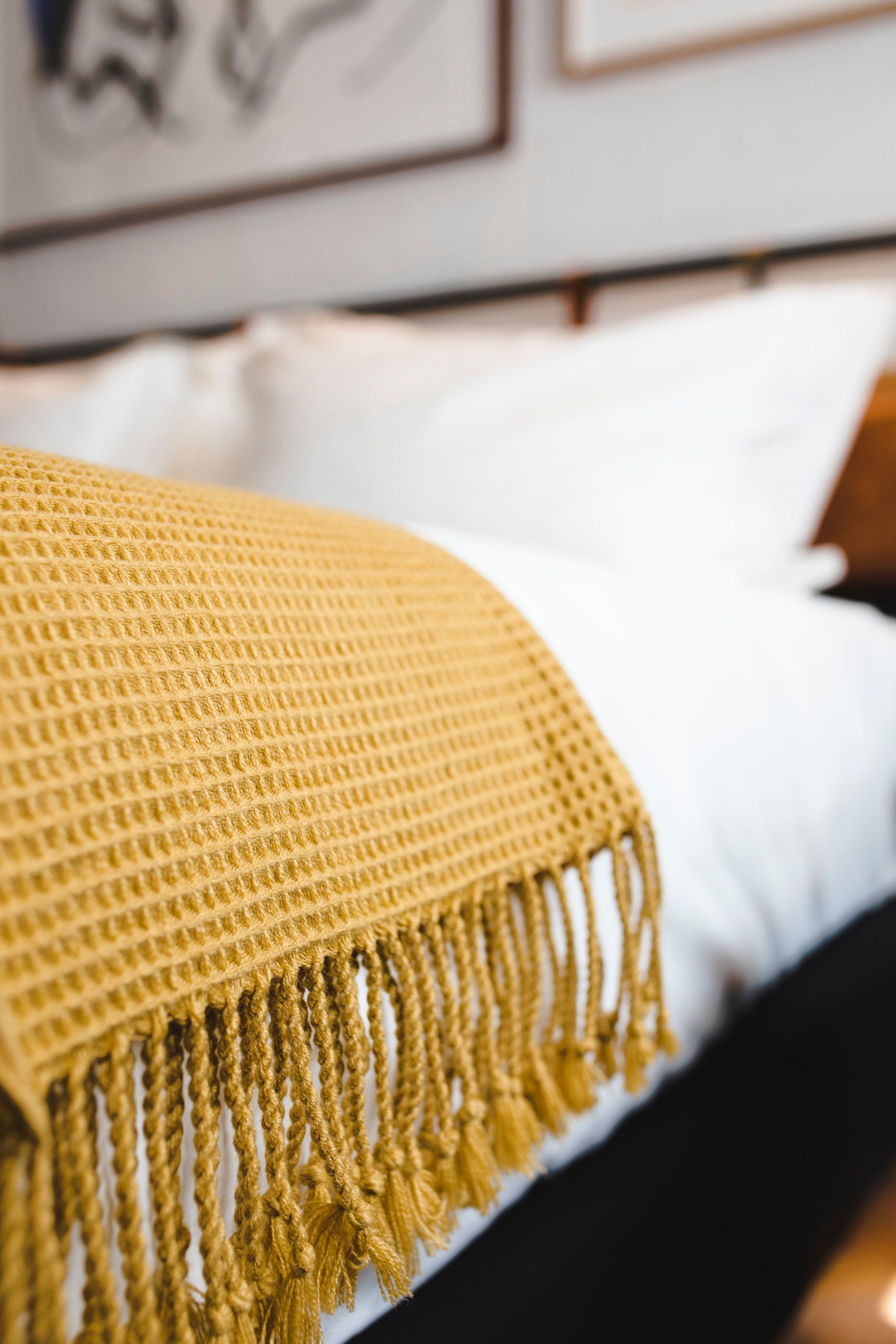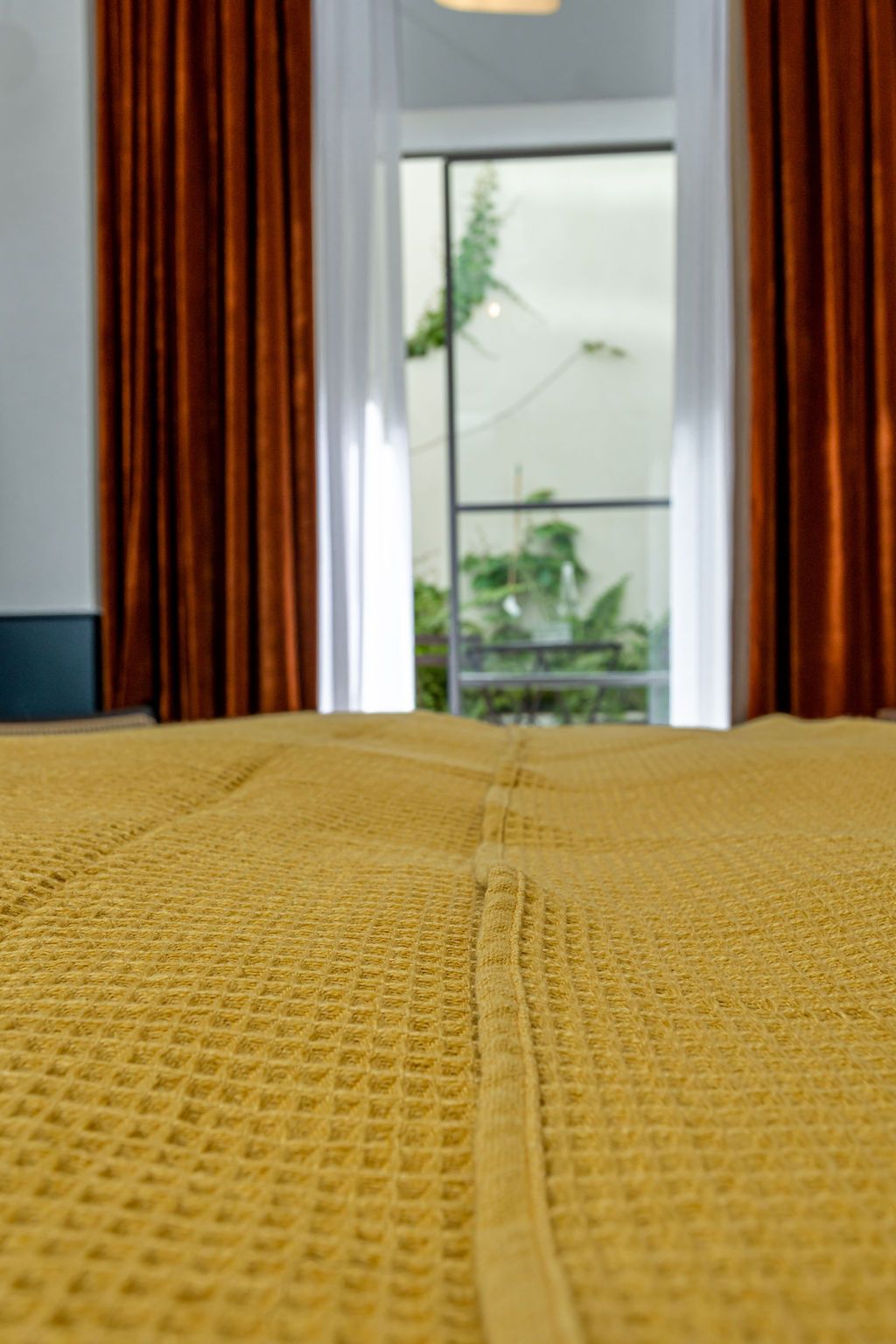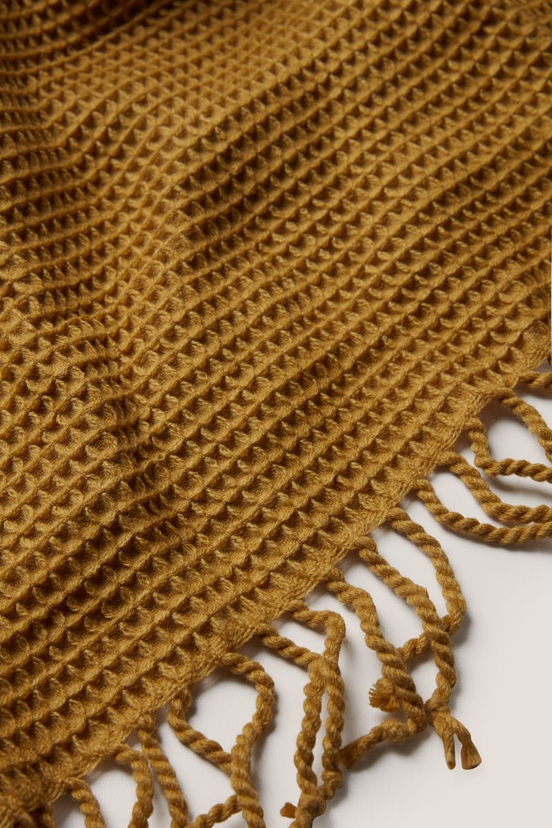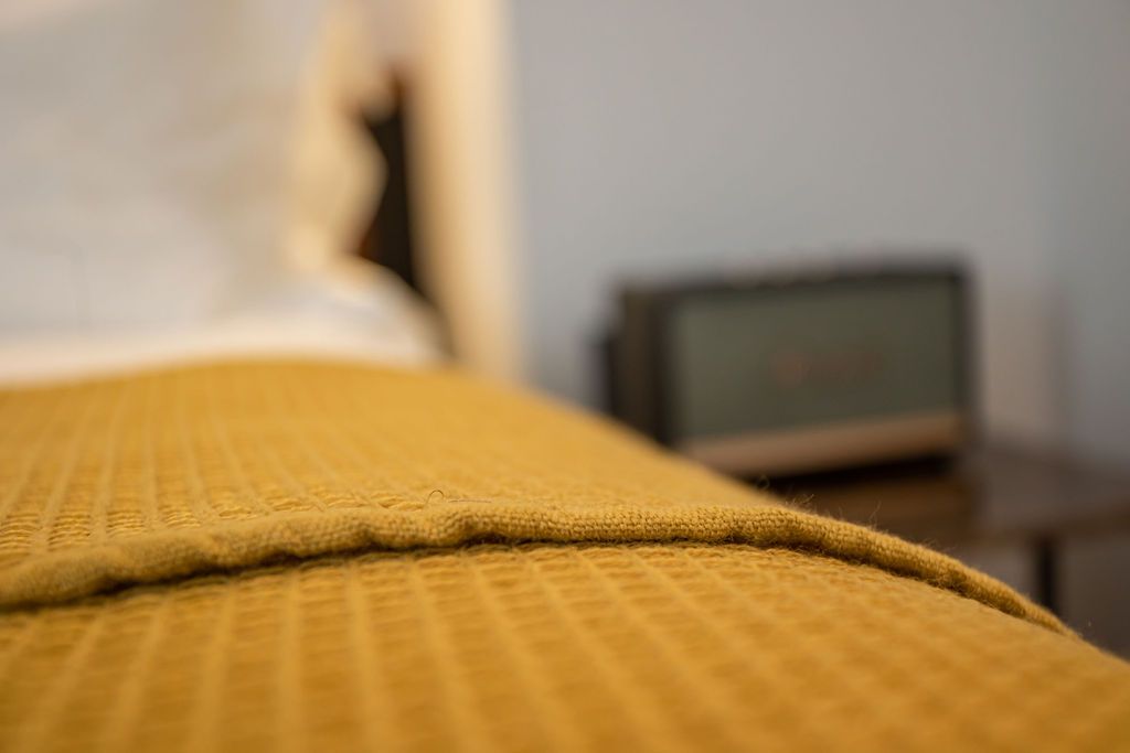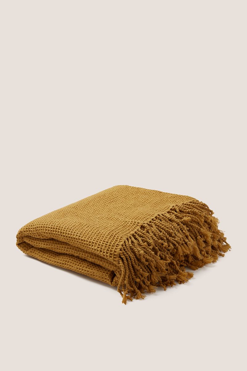 ראנר למיטה מחמם עבה ואיכותי, יכול לשמש גם ככרבולית לספה בסלון. טקסטורה דמוי פיקה, צבע חרדל. גודל: 220*180